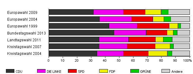 | Bundestagswahl 2013 | 58,8 | 46,3 | 22,8 | 14,9 | 4,3 | 3,0 | 8,7 | |
