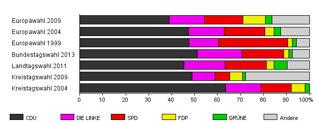 | Bundestagswahl 2013 | 59,9 | 51,1 | 19,5 | 18,1 | 2,2 | 1,7 | 7,5 | |
