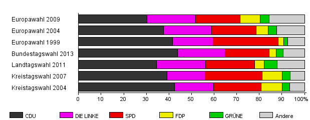 | Bundestagswahl 2013 | 61,7 | 43,7 | 21,1 | 19,6 | 3,0 | 3,1 | 9,6 | |