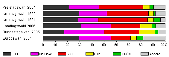 | Kreistagswahl 2004 | 72,3 | 21,0 | 24,9 | 35,9 | 5,4 | 3,3 | 9,5 | |