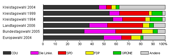 | Kreistagswahl 2004 | 60,6 | 45,5 | 6,3 | 4,0 | 3,7 | 2,8 | 37,7 | |