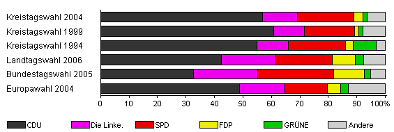 | Kreistagswahl 2004 | 46,0 | 56,9 | 12,1 | 20,0 | 3,1 | 1,4 | 6,5 | |