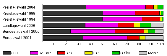 | Kreistagswahl 2004 | 76,9 | 36,0 | 49,3 | 6,7 | 3,2 | 4,8 | x | |