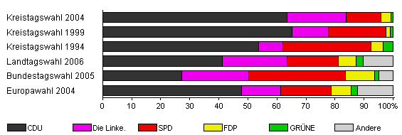 | Kreistagswahl 2004 | 56,9 | 63,5 | 20,4 | 12,0 | 3,3 | 0,8 | x | |