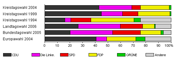 | Kreistagswahl 2004 | 62,2 | 43,0 | 25,8 | 6,9 | 22,9 | 1,4 | x | |