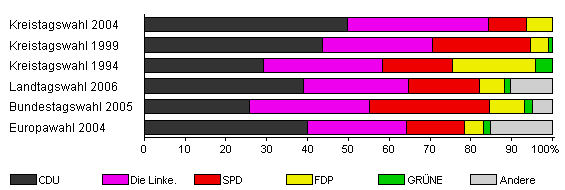 | Kreistagswahl 2004 | 43,5 | 49,8 | 34,4 | 9,5 | 6,3 | x | x | |