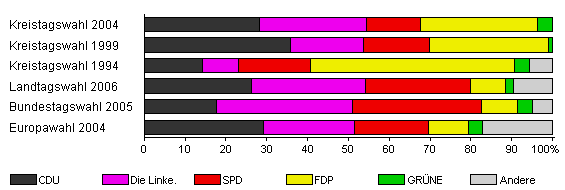 | Kreistagswahl 1994 | 67,7 | 14,2 | 8,9 | 17,5 | 50,1 | 3,7 | 5,6 | |
