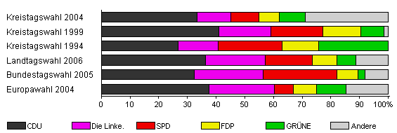 | Kreistagswahl 2004 | 45,8 | 33,3 | 11,9 | 9,8 | 7,1 | 8,9 | 28,9 | |
