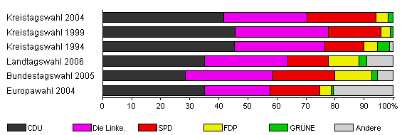 | Kreistagswahl 2004 | 52,5 | 41,6 | 28,8 | 23,8 | 4,0 | 1,8 | x | |