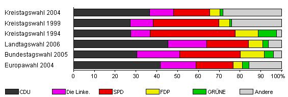 | Kreistagswahl 2004 | 50,9 | 36,5 | 11,6 | 17,3 | 5,0 | 1,4 | 28,0 | |