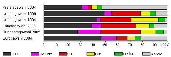 | Kreistagswahl 2004 | 46,4 | 30,8 | 5,3 | 2,7 | 4,6 | 3,6 | 53,0 | |