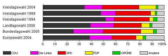 | Kreistagswahl 2004 | 43,6 | 34,0 | 14,9 | 30,3 | 13,9 | 1,8 | 5,2 | |