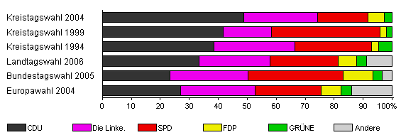 | Kreistagswahl 2004 | 55,8 | 48,8 | 25,4 | 17,4 | 5,7 | 2,7 | x | |