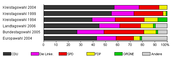 | Kreistagswahl 2004 | 66,5 | 57,0 | 20,1 | 16,2 | 6,6 | x | x | |