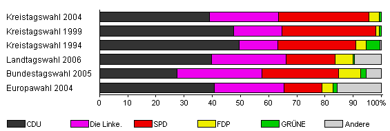 | Kreistagswahl 2004 | 52,5 | 39,0 | 24,4 | 32,1 | 3,8 | 0,7 | x | |