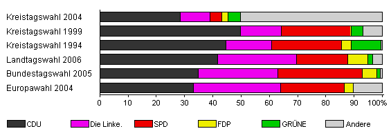 | Kreistagswahl 2004 | 50,0 | 28,4 | 10,5 | 4,2 | 2,2 | 4,5 | 50,2 | |