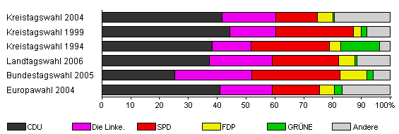 | Kreistagswahl 2004 | 39,4 | 41,7 | 18,5 | 14,5 | 5,5 | 0,4 | 19,4 | |
