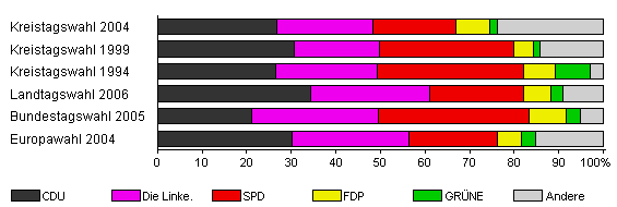 | Kreistagswahl 2004 | 34,0 | 26,7 | 21,6 | 18,6 | 7,6 | 1,6 | 23,9 | |
