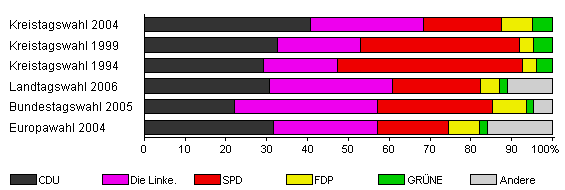 | Kreistagswahl 2004 | 51,6 | 40,8 | 27,6 | 19,1 | 7,6 | 4,9 | x | |