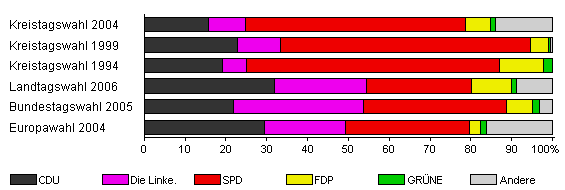 | Kreistagswahl 2004 | 53,2 | 15,7 | 9,1 | 53,8 | 6,1 | 1,2 | 14,0 | |