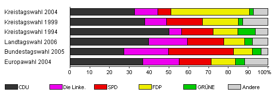 | Kreistagswahl 2004 | 54,1 | 32,6 | 11,7 | 6,6 | 39,8 | 2,0 | 7,4 | |