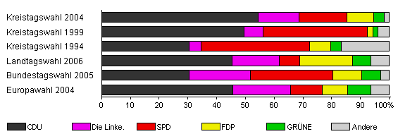 | Kreistagswahl 2004 | 55,7 | 54,4 | 14,2 | 16,7 | 9,3 | 3,7 | 1,7 | |