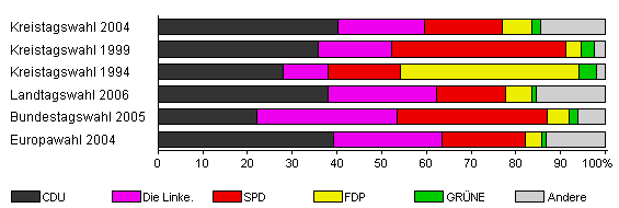 | Kreistagswahl 2004 | 63,7 | 40,2 | 19,4 | 17,3 | 6,7 | 1,8 | 14,7 | |