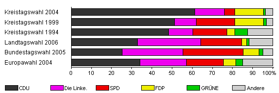 | Kreistagswahl 2004 | 51,7 | 61,3 | 14,6 | 5,1 | 14,2 | 1,0 | 3,7 | |