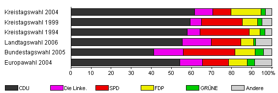 | Kreistagswahl 2004 | 55,2 | 61,5 | 9,1 | 9,1 | 14,8 | 2,2 | 3,3 | |