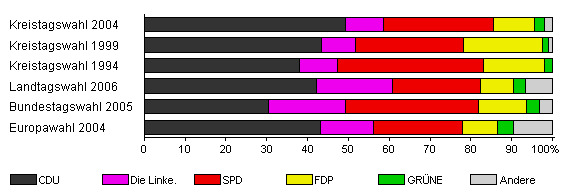 | Kreistagswahl 2004 | 53,1 | 49,2 | 9,4 | 27,0 | 10,0 | 2,4 | 1,9 | |