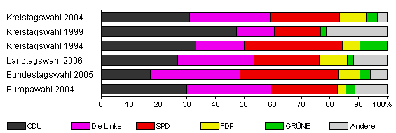 | Kreistagswahl 2004 | 53,6 | 31,0 | 28,1 | 24,2 | 9,2 | 4,1 | 3,4 | |
