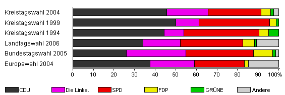 | Kreistagswahl 2004 | 31,8 | 45,7 | 20,0 | 25,7 | 4,6 | 1,4 | 2,6 | |