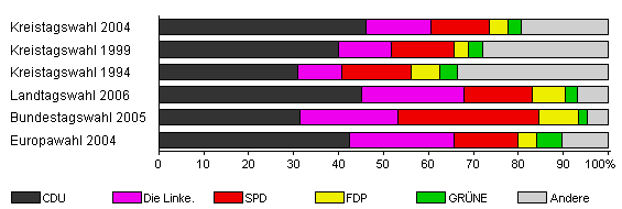 | Kreistagswahl 2004 | 38,7 | 46,1 | 14,5 | 12,9 | 4,3 | 2,9 | 19,3 | |