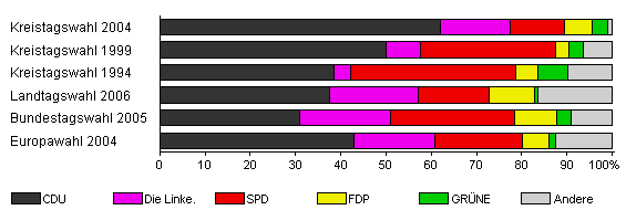 | Kreistagswahl 2004 | 49,7 | 62,1 | 15,4 | 11,9 | 6,2 | 3,5 | 0,9 | |