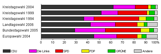 | Kreistagswahl 2004 | 39,5 | 62,1 | 18,8 | 10,9 | 2,5 | 3,9 | 1,8 | |