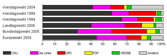 | Kreistagswahl 2004 | 39,3 | 41,2 | 15,3 | 10,8 | 2,6 | 3,5 | 26,6 | |