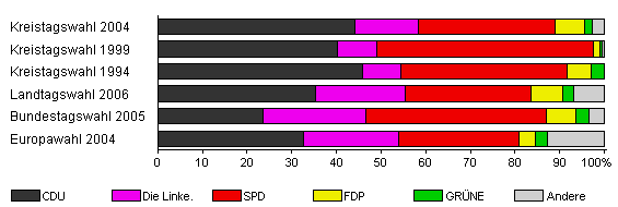 | Kreistagswahl 2004 | 39,4 | 44,2 | 14,1 | 30,6 | 6,7 | 1,7 | 2,8 | |