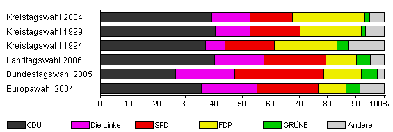 | Kreistagswahl 2004 | 46,2 | 39,3 | 13,5 | 14,8 | 25,6 | 1,7 | 5,1 | |