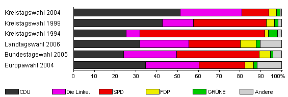 | Kreistagswahl 2004 | 49,3 | 51,2 | 29,7 | 13,0 | 3,7 | 1,7 | 0,6 | |