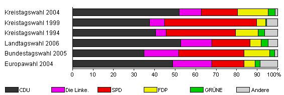 | Kreistagswahl 2004 | 67,1 | 51,9 | 10,8 | 17,6 | 15,0 | 3,4 | 1,3 | |