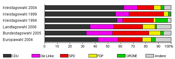| Kreistagswahl 2004 | 43,6 | 62,6 | 10,6 | 13,1 | 5,5 | 2,6 | 5,5 | |