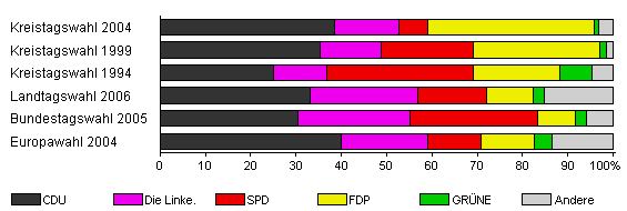 | Kreistagswahl 2004 | 55,1 | 38,5 | 14,2 | 6,4 | 36,7 | 1,0 | 3,2 | |