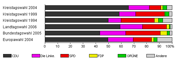 | Kreistagswahl 2004 | 47,3 | 65,7 | 16,4 | 9,0 | 1,6 | 3,0 | 4,4 | |
