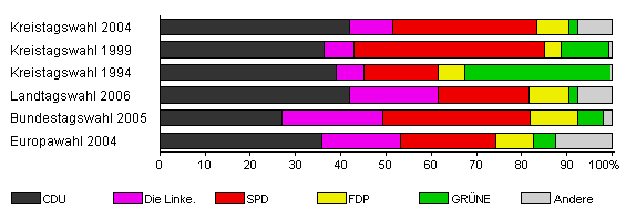 | Kreistagswahl 2004 | 46,2 | 42,0 | 9,5 | 31,8 | 7,0 | 2,0 | 7,7 | |