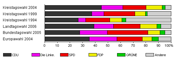 | Kreistagswahl 2004 | 45,4 | 44,8 | 17,0 | 18,3 | 12,7 | 2,5 | 4,7 | |
