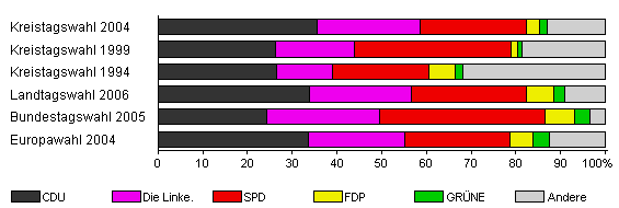 | Kreistagswahl 2004 | 37,3 | 35,6 | 23,0 | 23,8 | 2,9 | 1,7 | 13,0 | |