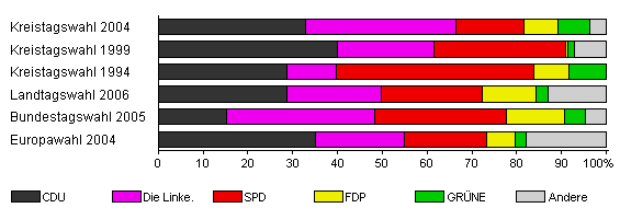 | Kreistagswahl 2004 | 61,7 | 32,8 | 33,5 | 15,2 | 7,8 | 6,9 | 3,8 | |