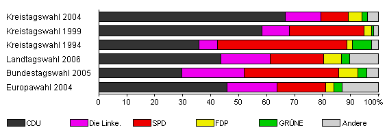 | Kreistagswahl 2004 | 46,2 | 66,6 | 12,7 | 10,0 | 4,8 | 1,9 | 4,0 | |