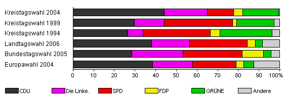 | Kreistagswahl 2004 | 50,6 | 44,2 | 20,8 | 12,6 | 4,6 | 17,3 | 0,4 | |