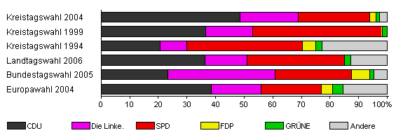 | Kreistagswahl 2004 | 72,3 | 48,6 | 20,3 | 24,9 | 2,3 | 1,1 | 2,8 | |